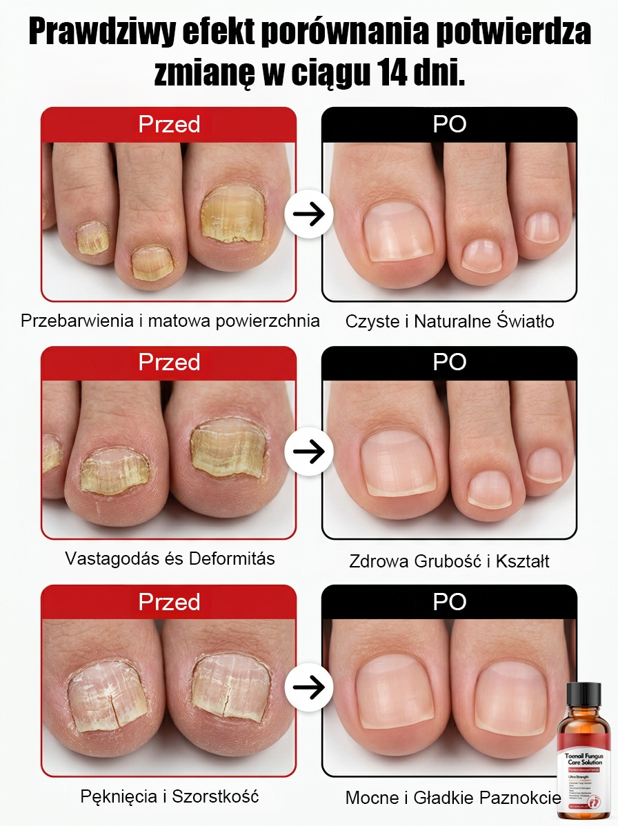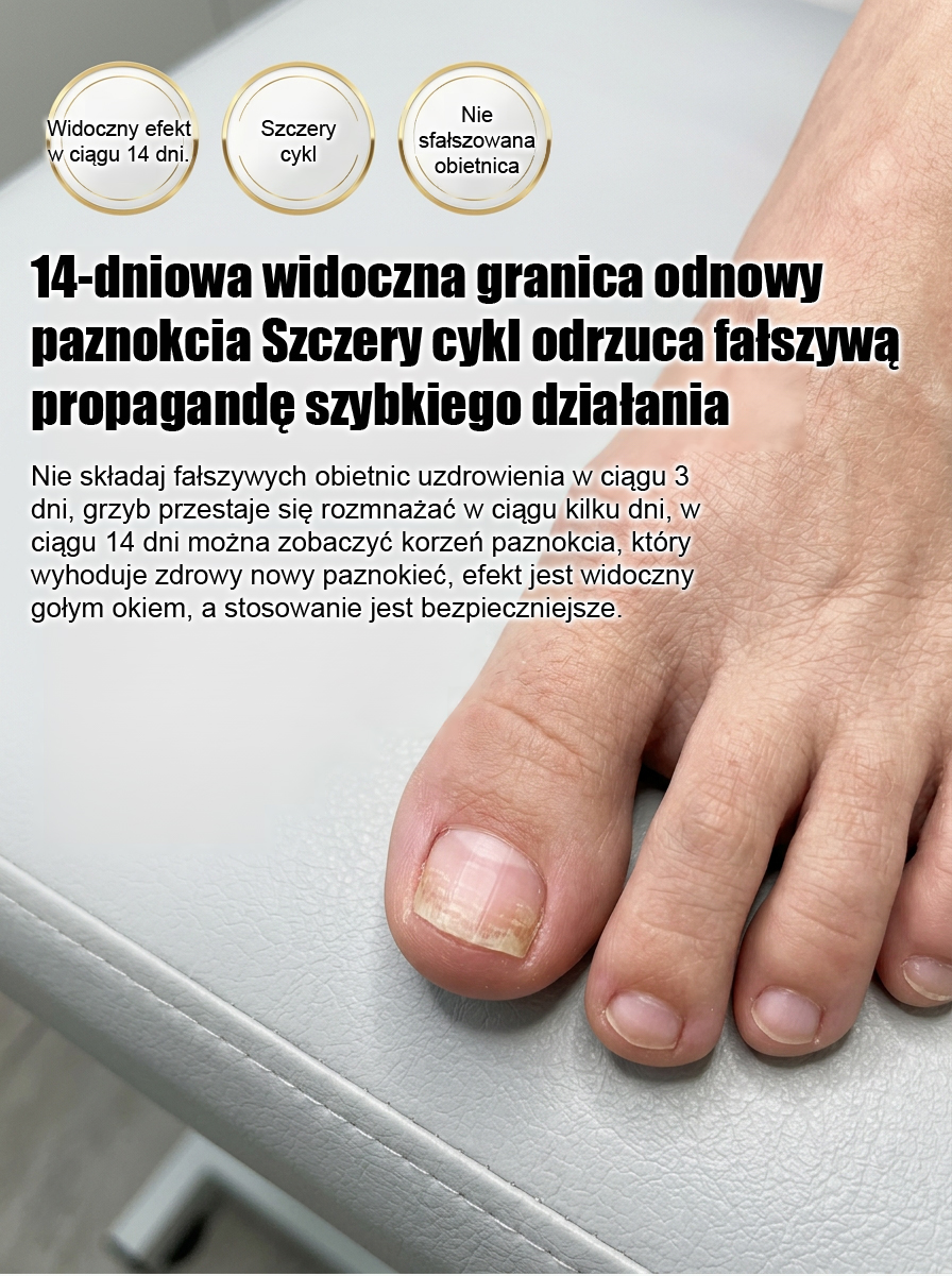 Odrzucamy wszelkie fałszywe obietnice typu „cuda w 3 dni” – solennie obiecujemy: wystarczy 14 dni, abyś gołym okiem mógł dostrzec rosnący brzeg zdrowego, nowego paznokcia!